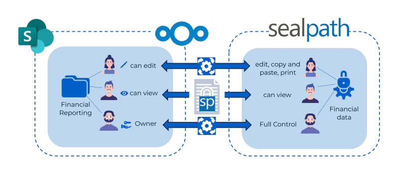 Sincronizzazione dinamica: Le autorizzazioni all’interno delle politiche federate SealPath rispecchiano le autorizzazioni dell’utente assegnate alla cartella. Ad esempio, un dipendente con permessi di modifica per una cartella SharePoint (ad esempio, Rendiconti finanziari) riceve permessi di modifica equivalenti per i documenti protetti all’interno di quella cartella.